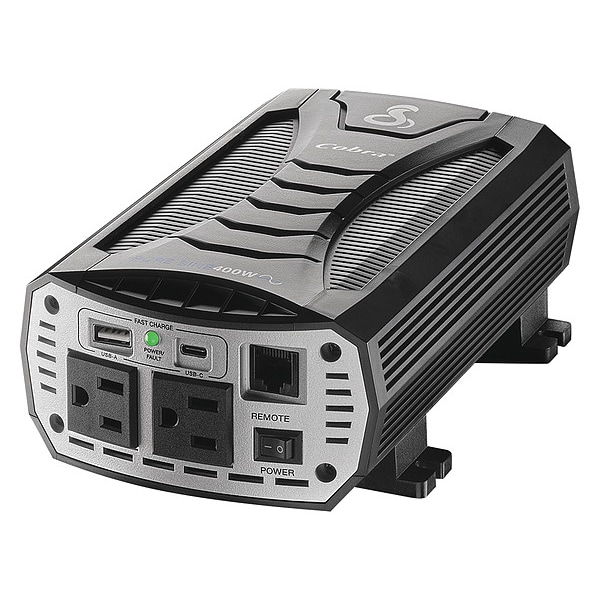 Inverter, Features Cobra Remote Compatible, LED Digital Display, Pentagon Protection Safety, Output Form Pure Sine Wave, DC Connection Input Terminals, Continuous Output Power 400 W, Peak Output Power 800 W, Number of Outlets 4, Input Voltage 10 to 15V DC, Output Voltage 115V AC, Output Frequency 60 Hz, Efficiency 90 Percent, Overall Depth 2 3/4 in, Overall Height 8 7/8 in, Overall Width 5 3/8 in, Outlet Type (2) GFCI, Number of Standard USB Ports 2