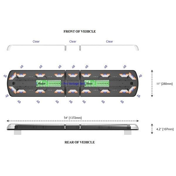 LED Lightbar, Light Type Emergency Vehicle Full-Size Light Bar, Light Color Amber/Blue, Wattage Not Applicable, Lens Color Clear, Shape Rectangular, Light Pattern Flashing, SAE Class Rating SAE J595 Class 1, SAE J845 Class 1, Electrical Connection Pre-Wired Cable, Lighting Technology LED, Installation Type Permanent, Operating Voltage 12-24V, Overall Length 54 in, Overall Diameter Not Applicable, Overall Height 2 1/2 in, Overall Depth 11 in, IP Rating Not Applicable
