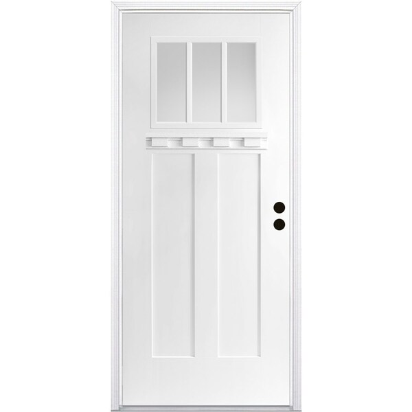 CODEL Doors' Fiberglass Front Doors are built to last and our 3-Panel Shaker Exterior Fiberglass door can add substanial curb appeal to your home. This smooth 3-panel shaker fiberglass door comes with clear glass in a 3-Lite frame and dentil show for a true craftsman design. The fiberglass doors are virtually maintenance free and won't dent, warp rot, or split. Our premium prehung door unit almost eliminates air and water inflitration with a variety of premium features. Door comes primed and ready to paint any color to match your home's style.