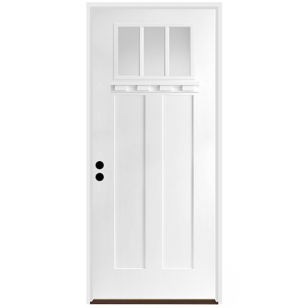 CODEL Doors' Fiberglass Front Doors are built to last and our 3-Panel Shaker Exterior Fiberglass door can add substanial curb appeal to your home. This smooth 3-panel shaker fiberglass door comes with clear glass in a 3-Lite frame and dentil show for a true craftsman design. The fiberglass doors are virtually maintenance free and won't dent, warp rot, or split. Our premium prehung door unit almost eliminates air and water inflitration with a variety of premium features. Door comes primed and ready to paint any color to match your home's style.