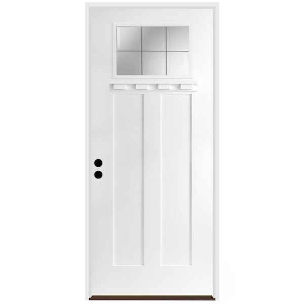 CODEL Doors' Fiberglass Front Doors are built to last and our 3-Panel Shaker Exterior Fiberglass door can add substanial curb appeal to your home. This smooth 3-panel shaker fiberglass door comes with 6-lite patina glass in a 3-Lite frame and dentil show for a true craftsman design. The fiberglass doors are virtually maintenance free and won't dent, warp rot, or split. Our premium prehung door unit almost eliminates air and water inflitration with a variety of premium features. Door comes primed and ready to paint any color to match your home's style.