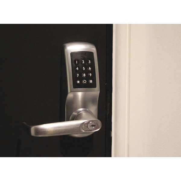 Electronic Keyless Lock, Function Classroom/ Storeroom, Access Method Keypad, Mounting Style Vertical, Lock Material Zinc Alloy, Finish Brushed Steel, Series CL5000, Handle Type Lever, Door Thickness 1-3/8 in to 2-3/8 in, Key Override Options Interchangeable Core, Hand Nonhanded, Network Interface None, Outside Height 7 3/4 in, Outside Width 2 3/4 in, Keypad Material Hardened Plastic, Power Source (4) AA Batteries, Battery Life 200,000 Cycles, Max. User Codes 100, Fire Rating 3 hr