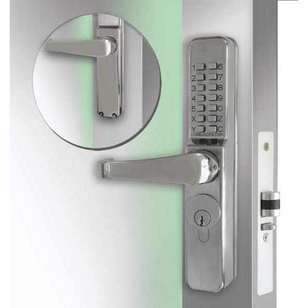 Mechanical Push Button Lockset, Handle Type Lever, Function Entry, Key Override Options None, Hand Nonhanded, Finish Stainless Steel, Door Thickness 1-3/8 in to 2-1/2 in, Keypad 13 Button, Vandal Resistant, Backset 2 3/4 in, ADA Compliant Yes, No Fire Rated, Case Material Zinc, Series CL400, Latch Length 2 3/4 in, Max. User Codes 1, Standards ANSI, Weather Resistant Yes, Includes Code Change Plug, Lock, Template, Mechanical