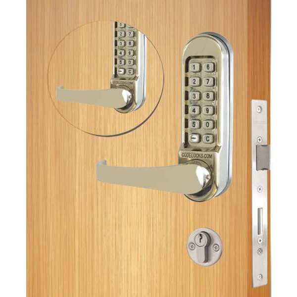 Mechanical Push Button Lockset, Handle Type Lever, Function Entry, Key Override Options None, Hand Nonhanded, Finish Stainless Steel, Door Thickness 1-3/8 in to 2-1/2 in, Keypad 11 Button, Vandal Resistant, Backset 2 3/4 in, ADA Compliant Yes, No Fire Rated, Case Material Zinc, Series CL500, Latch Length 2 3/4 in, Max. User Codes 1, Standards ANSI Grade 1, Weather Resistant Yes, Includes Code Change Plug, Lock, Mortise Lock with Code Free Function Back to Back, Template, Mechanical