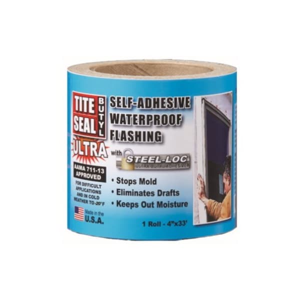 4 x 33', White, Butyl Flashing, Tite Seal, Waterproof, Self Adhesive Flashing Composed Of Our New SteelLoc Butyl Adhesive A PolyEthylene Facing Material, Aggressively Adheres To Wood, OSB, Aluminum, Vinyl, House Wrap, Steel Drywall Studs More, Can Be Applied To Temperatures As Low As 15 Degrees Without Need Of Primer, Impermeable To Water, Moisture Vapor Air, Can Be Used To Flash Around Windows Doors, Seal Joints In Sheathing Panels, Around Vents, Other Openings, Use Under Most Exterior Surfaces Including Brick, Stucco, Wood Vinyl Or Wood Siding Can Be Left Exposed For 180 Days