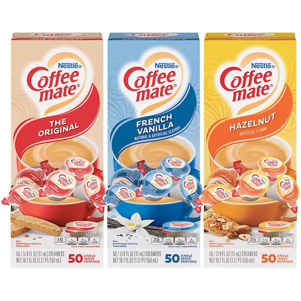 Delight your employees, customers and guests by offering Coffee mate liquid creamer in your workplace, breakroom or kitchen. Variety pack includes three flavors, including Original, French and Hazelnut. French vanilla liquid creamer offers a deliciously creamy, classic vanilla taste that's perfect anytime. Hazelnut flavor coffee creamer is the perfect way to create a delicious cup of nutty sweetness. Rich, smooth flavor makes it perfect for the breakroom or reception so everyone can enjoy coffeehouse indulgence without ever leaving your office building. The nondairy creamer is lactose-free, gluten-free and Kosher Dairy. The single-serve tubs do not require refrigeration.