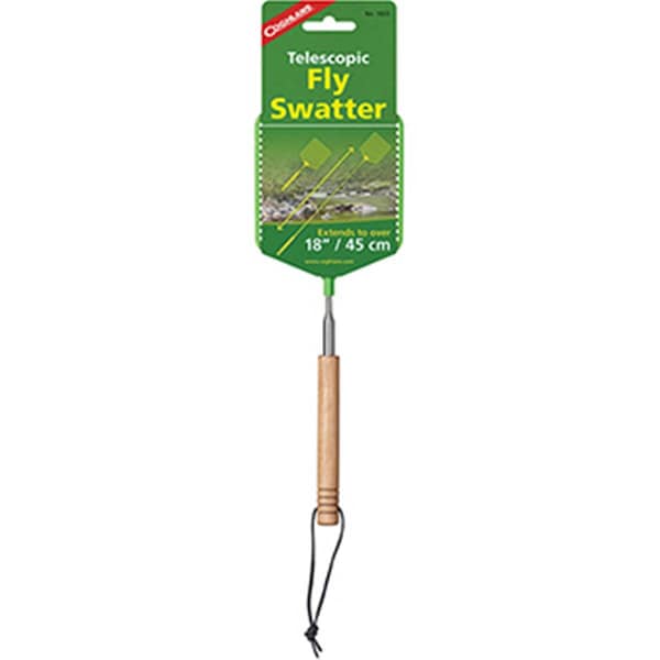 This compact fly swatter is ideal to eliminate pesky flies, mosquitos, or other insects. measures only 11.5 when compressed, with a reach of over 18 when extended. Features A comfortable wooden handle and leather strap for hanging when not in use Ideal for camping, rv excursions or use at the cabin