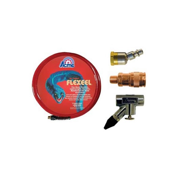 In-Line Blow Gun with Rubber Tip, 1/4 Inch Ball Swivel Industrial Interchange Connector, 1/4 Inch Automatic Universal Male Coupler, 3/8 Inch x 35 Foot Flexeel Hose