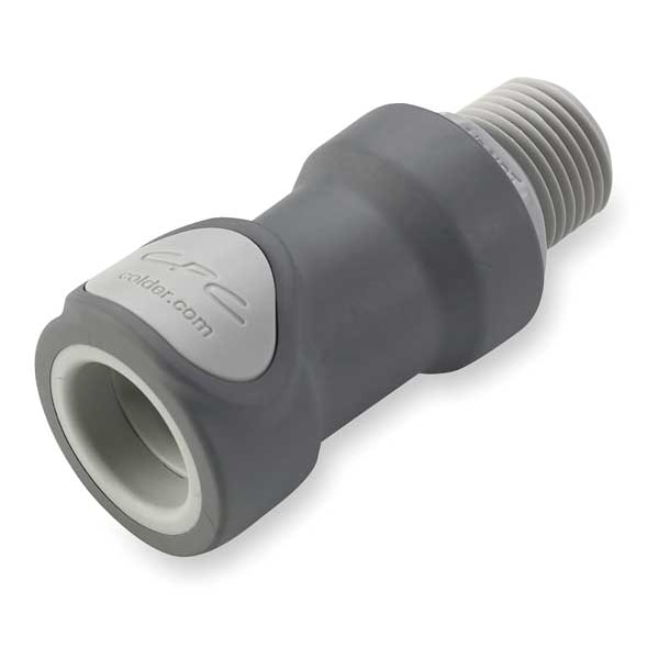 Quick Connection Coupling, Application Air, Non-Potable Water, Fitting Side A Connection Type Coupler, Fitting Side B Connection Type MNPT, Flow Control Type Shut-off, Fitting Side B Pipe Size 1/2 in, Fitting Material Polypropylene, Overall Length 3 in, Specific Fitting Shape Straight Coupler, Material Grade Not Applicable, Standards NSF/ANSI 51, RoHS, Color Gray, Compatible Tube Hardness Not Applicable, Compatible Tube Material Not Applicable, Compatible Tube Wall Thickness Not Applicable