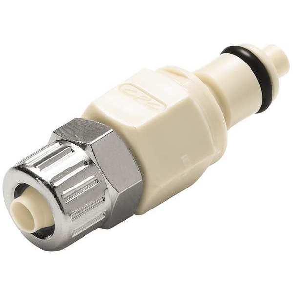 Quick Connection Coupling, Application Air, Non-Potable Water, Fitting Side A Connection Type Insert, Fitting Side B Connection Type Tube, Fitting Side A Tube Inner Diameter 1/4 in, Fitting Side B Tube Inner Diameter 17/100 in, Flow Control Type Flow-through, Fitting Material Polypropylene, Overall Length 1 5/32 in, Specific Fitting Shape Straight Coupler, Material Grade Not Applicable, Fitting Side B Tube Outer Diameter 1/4 in, Standards FDA Approved, RoHS, USDA, Color Almond