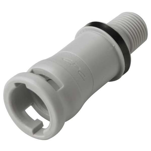 Quick Connection Coupling, Application Air, Non-Potable Water, Fitting Side A Connection Type Coupler, Fitting Side B Connection Type MNPT, Flow Control Type Shut-off, Fitting Side B Pipe Size 1/8 in, Fitting Material Polypropylene, Overall Length 1 3/4 in, Specific Fitting Shape Straight Coupler, Material Grade Not Applicable, Standards FDA Approved, RoHS, USDA, Color Gray, Compatible Tube Hardness Not Applicable, Compatible Tube Material Not Applicable