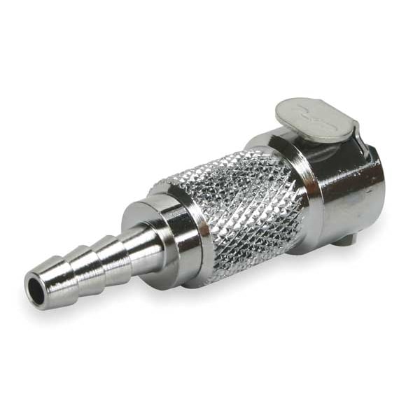 Quick Connection Coupling, Application Air, Non-Potable Water, Fitting Side A Connection Type Barbed, Fitting Side B Connection Type Coupler, Fitting Side A Tube Inner Diameter 5/16 in, Flow Control Type Shut-off, Fitting Material Brass, Overall Length 2 in, Specific Fitting Shape Straight Coupler, Finish/Coating Chrome Plated, Material Grade CA360, Compatible Tube Hardness Not Applicable, Compatible Tube Material Not Applicable, Compatible Tube Wall Thickness Not Applicable