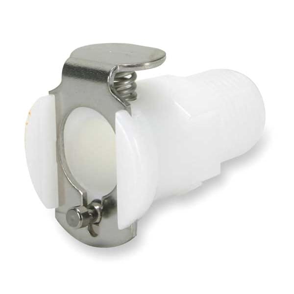 Quick Connection Coupling, Application Air, Non-Potable Water, Fitting Side A Connection Type Coupler, Fitting Side B Connection Type MNPT, Flow Control Type Flow-through, Fitting Side B Pipe Size 1/4 in, Fitting Material Acetal, Overall Length 1 5/32 in, Specific Fitting Shape Straight Coupler, Material Grade Not Applicable, Standards FDA Approved, NSF, RoHS, USDA, Color White, Compatible Tube Hardness Not Applicable, Compatible Tube Material Not Applicable