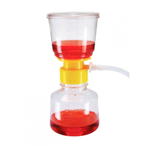 Sterile Vacuum Bio-Filtrators have a built in 50mm diameter filter with a pore size of 0.22μm. Ideal for use in filtering biological fluids, culture media and other aqueous solutions. Item has a wide bottle opening for easy access and pouring the product. The funnel and bottle are manufactured from optically clear polystyrene. The filter adapter is manufactured from 100% virgin polypropylene.