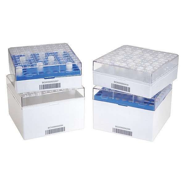 Cryogenic Vial 2D Box, Polycarbonate, Translucent, Overall Height 2 In., Overall Width 5-1/4 In., Overall Length 5-1/4 In., Holds 2mL Cryogenic Tubes