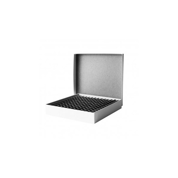 Freezer box with insert designed exclusively for PCR tubes including strip formats and individual tubes. Each box will accommodate up to 196 x 0.2ml tubes in a 14 x 14 array. Box features a one inch shallow depth to provide easy access to tubes. Outer box dimensions are 5 1/4 x 5 1/4 x 1 inches and can be double stacked for storing in a standard freezer rack. Box and insert are suitable for storage at temperatures from 0°C to -80°C. Holds 8 tube strips or 12 tube strips.