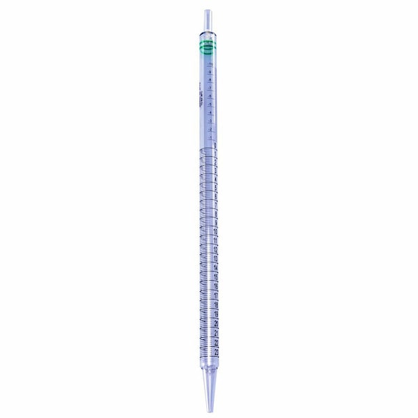 Designed for accurate and rapid fluid dispensing; these polystyrene pipettes are sterile, pyrogen free and utilize a unique filter plug to prevent overfilling. The filter plug eliminates lint fibers and ensures plug stays in place. The sharp, black, highly legible permanent graduations prevent ambiguity and precise reading and accurate dispensing to ±:2%. Reverse graduations show volume removed or remaining on all pipettes larger than 1mL. Generous negative graduations provide additional pipetting volume. Pipettes are made from transparent medical grade polystyrene sterilized by gamma irradiation. Each lot is tested for endotoxins (C.5 Eu/mL) (ISO T0993-11), cytotoxicity (ISO10993-5) and are non-hemolytic (ISO10993-4). Ideal for tissue culture applications. Pipettes are supplied in bulk in a fiber-free paper & plastic combination that is easy to open. The uniform mouth piece fits all major pipettors and have color coded TD rings for ease of identification. 1.1mL bacteriological pipettes meet the A.P.H.A. standards for the examination of dairy products. Calibrated TD with blow out. Meets ASTM E934. Dispenser box allows user to remove pipettes without opening top. Universal stacking design requires less laboratory space and each box is color coded for easy recognition.