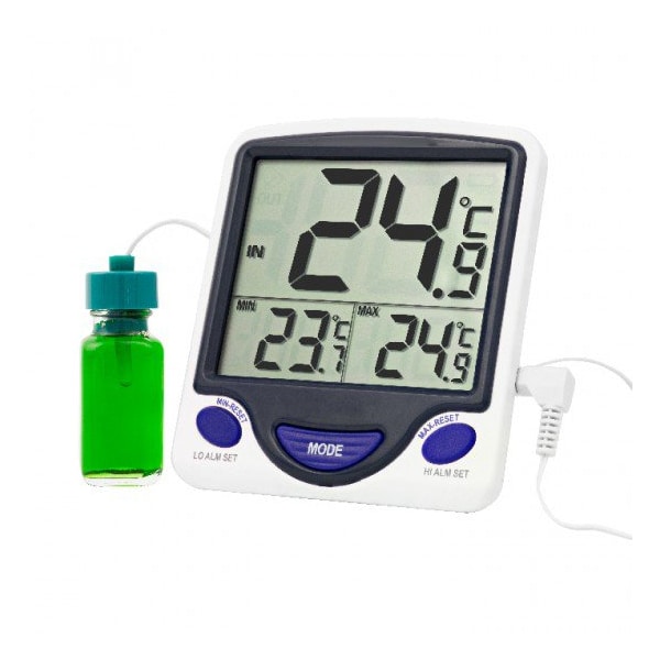 Ideal Digital Thermometer for monitoring temperatures in refrigerators, freezers, incubators, and water baths. Available with glass enclosed temperature buffered sensor that provides a stable reading when refrigerator or freezer door is opened. Displays minimum, maximum, current probe temperature plus room temperature. Temperature range: -58: to 158°F -50 to 70°C with accuracy of +1°C. Additional features include: built-in alarm and sealed probe. Supplied with battery, certificate of calibration and 10 foot cable. Probe Temperature Range: -50 to 70°C -58 to 158°F Probe Temperature Resolution: 0.1° Probe Temperature Accuracy: ±1°C Number of Probes: 1 Included Probe: Bottle specifically for refrigerator/freezer applications patented Probe Dimensions: 1x 2 1/2 Inches Cable Length: 10 Feet LCD Digit Size: 1 1/2 inches Dimensions: 3 7/8 x 4 3/8 x 7/8 Inches, ABS plastic case Weight: 4 Ounces Traceable: Yes CE Marked: YesShipping Weight: 0.75 lbsShipping Dimensions: 4.50 x 8.00 x 2.00Research or further manufacturing use only, not for food or drug use.