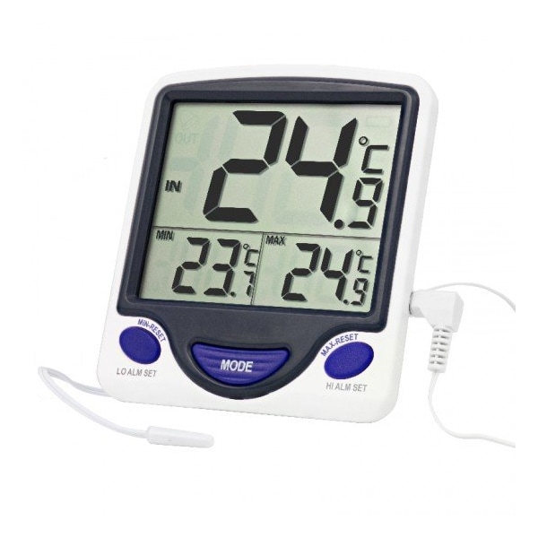 Ideal Digital Thermometer for monitoring temperatures in refrigerators, freezers, incubators, and water baths. Offered with a 3/16'' diameter x 3/4'' probe for immersion in tubes, heating blocks and water baths. Displays minimum, maximum, current probe temperature plus room temperature. Temperature range: -58: to 158°F -50 to 70°C with accuracy of +1°C. Additional features include: built-in alarm and sealed probe. Supplied with battery, certificate of calibration and 10 foot cable.Probe Temperature Range: -50 to 70°C -58 to 158°FProbe Temperature Resolution: 0.1°Probe Temperature Accuracy: ±1°CNumber of Probes: 1Included Probe: Bottle specifically for refrigerator/freezer applications patentedProbe Dimensions: 1 x 2 1/2 InchesCable Length: 10 FeetTemp MIN/MAX Memory: YesLCD Digit Size: 1 1/2 inchesDimensions: 3 7/8 x 4 3/8 x 7/8 Inches ABS plastic caseWeight: 4 Ounces Traceable: YesCE Marked: YesShipping Weight: 0.4101 lbsShipping Dimensions: 5.00 x 6.00 x 1.00Research or further manufacturing use only, not for food or drug use.