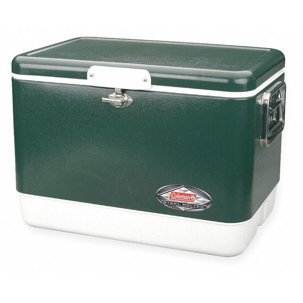 Chest Cooler, Chest Cooler, With Wheels No, 54 qt, Exterior Length 24 1/4 in, Exterior Width 16 3/4 in, Exterior Height 16 3/4 in, Metal, Ice Retention Up to 3 days, Body Color Green, Lid Color Green, Number of Cans 85