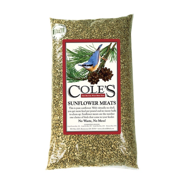 Cole's sunflower meats are super clean, whole bakery kernels - more nutritious than course and fine chips. This is pure sunflower and the birds number one choice. With almost no shell, you get more feed per pound and no messy hulls to clean up. Birds that like sunflower meats bluebirds, chickadees, cardinals, titmice, finches, woodpeckers, wrens, buntings, grosbeaks, towhees, nuthatches, song sparrows and doves.