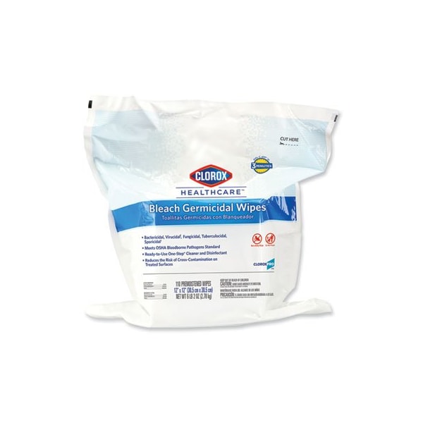 Healthcare professionals trust Clorox Healthcare Bleach Germicidal Wipes to help them overcome infection control challenges in a constantly changing healthcare environment. Clorox Healthcare Bleach Germicidal clinical wipes are ready to use, 1 step cleaner containing a 1:10 bleach dilution to meet CDC and OSHA guidelines for disinfecting surfaces in healthcare settings. Designed for daily disinfection, high-touch surfaces and medical equipment. These wipes are EPA registered to kill a total of 58 microorganisms, including HAI causing bacteria like MRSA and VRE in 30 seconds, outbreak causing viruses such as Influenza A and B viruses, Measles virus and Norovirus in 1 minute and C. difficile spores, TB and fungi in 3 minutes. These wipes kill 99.9999% of C. difficile spores, according to the current EPA recommended testing standard June 2014. These wipes are engineered minimize residue and leave less visible residue on surfaces vs. competitor bleach wipes. They are formulated with an anticorrosion agent and are compatible with common healthcare surfaces including stainless steel, glass, plastic, porcelain, glazed ceramic, laminated surfaces and vinyl. Intended for use in healthcare settings. Refill. Towel/Wipe Type: Disinfecting Wipes; Application: Hospitals; Medical Facilities; Nursing Homes; Applicable Material: Acrylic; Ceramic; Chrome; Fiberglass; Glass; Metal; Plastic; Tile; Vinyl; Wood; Materials: Nonwoven Fiber.