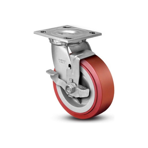 Colson 4 series swivel plate caster 4.04109.929 brk7 ss polyurethane with brake 4"dia. 600 lb. Cap. all stainless steel construction mechanically bonded non-marking tread straight roller bearing in wheel zerked raceway & axle for easy maintenance all metal top lock brake standard top plate