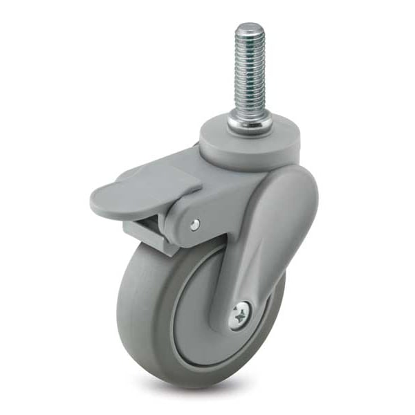 Stem Caster, Swivel Caster with Brake, 125 lb Load Rating, 0 to 299 lb, 4 in Wheel Dia., 1 in Wheel Width, Polyurethane Wheel/Tread Material, 5 3/8 in Mounting Height, Delrin, 5/16 In.-18 x 1 in Caster Stem Size, Threaded, Glass Filled Nylon Caster Frame Material, Unfinished Frame Finish, Yes Non-Marking, 1 Number of Wheels