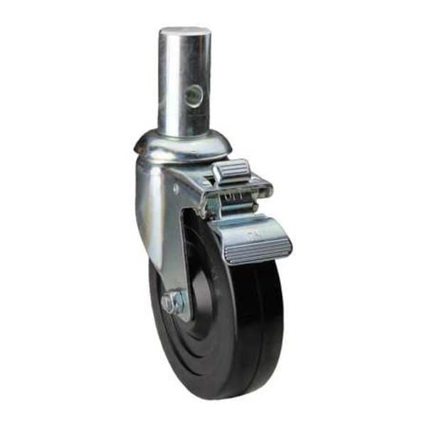 Stem Caster, Swivel Caster with Total Lock, 240 lb Load Rating, 0 to 299 lb, 5 in Wheel Dia., 1 1/4 in Wheel Width, Rubber Wheel/Tread Material, 6 3/16 in Mounting Height, Delrin, 1-1/4 in x 2-1/2 in Caster Stem Size, Round, Steel Caster Frame Material, Zinc Plated Frame Finish, No Non-Marking, 1 Number of Wheels
