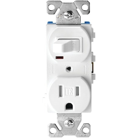 Switches and Lighting Controls, Combination Devices, Residential Grade, Decorator Series, 1) Single Pole Rocker, 1) Single Tamper Resistant Receptacle, 15A 120V AC, Side Wired