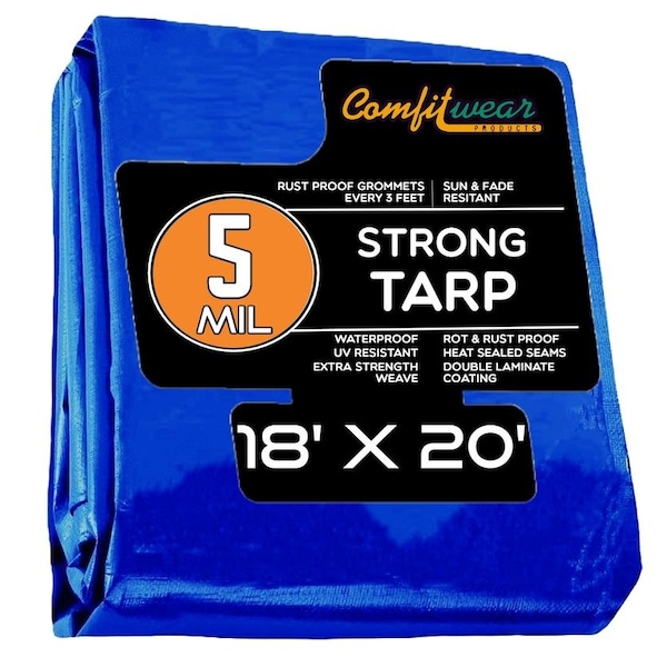 ABOUT THIS PRODUCT: All COMFITWEAR Tarps are made from an extra strength weave and has a heavy duty double laminated coating to ensure the best quality! COMFITWEAR Tarps are sun and fade resistant and rot & rust proof too! We put extra care in all our products. COMFITWEAR Tarps also have a rope reinforced hem Dare to Compare? Take notice of our heat-sealed seams and grommets every 3 feet! COMFITWEAR Tarps are widely used by contractors, campers, farmers and pointers for covering construction sites, farm equipment, sports equipment, machinery, trucks, boats, tools and so much more! WE COVER EVERYTHING!! Available in a wide variety of sizes ranging from 5' x 7' to 100' x 100' Choose Your Favorite Color! Brown MTB, Blue MT, Green MTG, Silver ST. Sizes range from 5 X 7 thru 100 X 100 Rope reinforced hem double stitched and COMFITWEAR Tarps are packed in heavyweight poly bags.