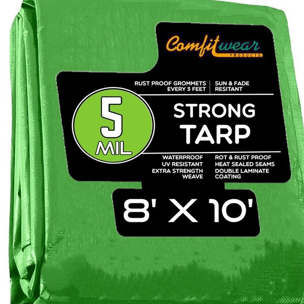 ABOUT THIS PRODUCT: All COMFITWEAR Tarps are made from an extra strength weave and has a heavy duty double laminated coating to ensure the best quality! COMFITWEAR Tarps are sun and fade resistant and rot & rust proof too! We put extra care in all our products. COMFITWEAR Tarps also have a rope reinforced hem Dare to Compare? Take notice of our heat-sealed seams and grommets every 3 feet! COMFITWEAR Tarps are widely used by contractors, campers, farmers and pointers for covering construction sites, farm equipment, sports equipment, machinery, trucks, boats, tools and so much more! WE COVER EVERYTHING!! Available in a wide variety of sizes ranging from 5' x 7' to 100' x 100' Choose Your Favorite Color! Brown MTB, Blue MT, Green MTG, Silver ST. Sizes range from 5 X 7 thru 100 X 100 Rope reinforced hem double stitched and COMFITWEAR Tarps are packed in heavyweight poly bags.