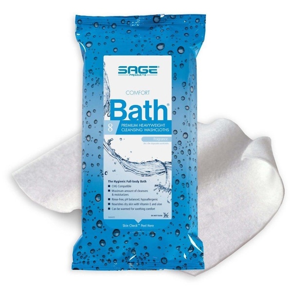 Rinse-Free Bath Wipe Comfort Bath Premium Heavyweight Soft Pack Water / Glycerin / Aloe / Vitamin E Scented 8 Count Purified water and cleansers leave skin feeling clean Moisturizers enriched with aloe and vitamin E for soft, nourished skin Ultra-thick heavyweight cloths are softer than the average washcloth and gentle on the skin Insulated package keeps the cloths warm Scented, yet hypoallergenic for a fresh feel