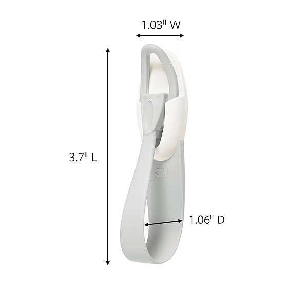 Single Point Hook, Fastening Method Adhesive Back, Points per Hook 1, Number of Hooks 1, Basic Hook Material Molded Plastic, Hook Finish Glossy, Working Load Limit 3 lb, Hook Height 3 5/8 in, Hook Base Width 1 in, Projection 1 in, Gray/White, Depth 1 in, Thread Size Not Applicable, Thread Length Not Applicable, Includes (2) Cord Bundlers, (3) Strips, Mounting Command(TM) Adhesive Pressure Sensitive Strip, Overall Length 3 3/4 in, Package Quantity 2