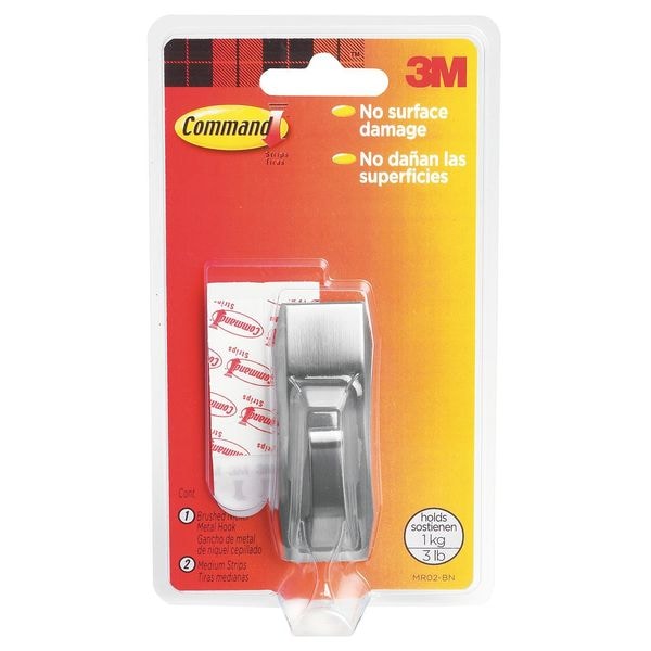 Single Point Hook, Fastening Method Adhesive Back, Points per Hook 1, Number of Hooks 1, Basic Hook Material Metal, Hook Finish Brushed Nickel, Working Load Limit 3 lb, Hook Height 3 1/8 in, Hook Base Width 1 1/8 in, Projection 1 1/8 in, Nickel, Depth 1 1/8 in, Thread Size Not Applicable, Thread Length Not Applicable, Includes (2) Strips, Hook, Mounting Command(TM) Adhesive Pressure Sensitive Strip, Overall Length 3 1/8 in