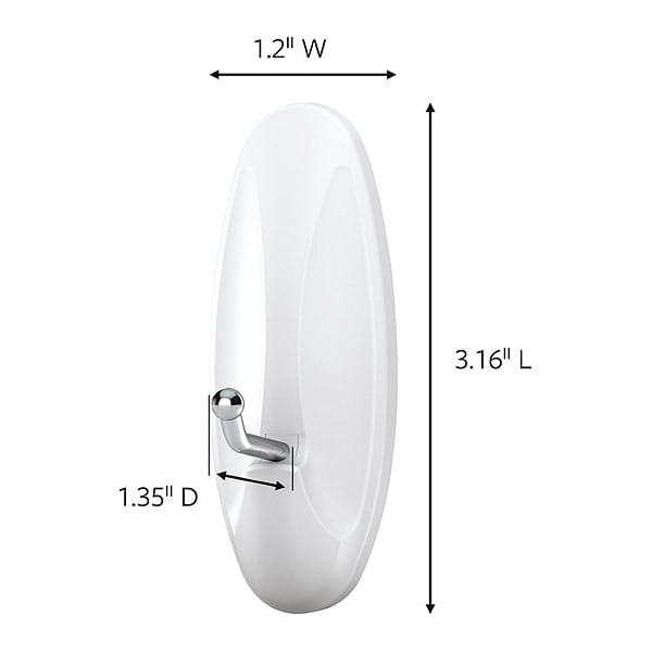 Single Point Hook, Fastening Method Adhesive Back, Points per Hook 1, Number of Hooks 7, Basic Hook Material Metal, Hook Finish Plastic, Working Load Limit 3 lb, Hook Height 3 1/8 in, Hook Base Width 1 1/4 in, Projection 1 1/4 in, White, Thread Size Not Applicable, Thread Length Not Applicable, Includes (12) Strips, (7) Hooks, Package Quantity 7