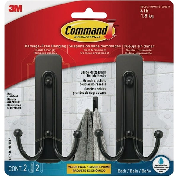 Large Double Bath Hook Matte Black 2 Hooks 2 Strips