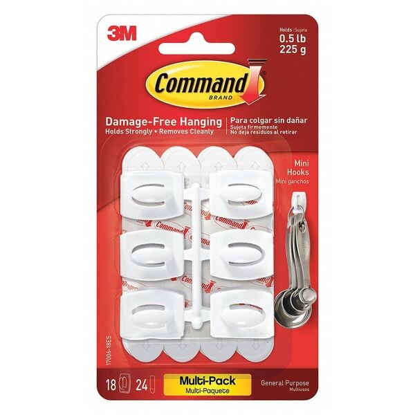 Mini Hook, Fastening Method Adhesive Back, Points per Hook 1, Number of Hooks 18, Basic Hook Material Plastic, Hook Finish Plastic, Working Load Limit 1/2 lb, Hook Height 1 in, Hook Base Width 43/50 in, Projection 3/8 in, White, Hook Eye Inside H Not Applicable, Hook Eye Inside W 13/64 in, Base Dia. Not Applicable, Depth 3/8 in, Weight 0.08 lb, Thread Length Not Applicable, Door Thickness Not Applicable, Includes (24) Adhesive Strips, Mounting Command(TM) Adhesive Pressure Sensitive Strip