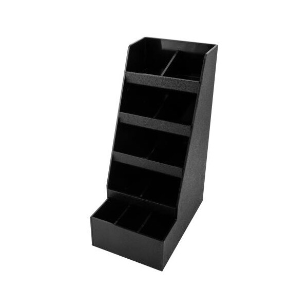 Condiment holder; 15 in (H) x 6 1/3 in (W) x 9 3/4 (L) ; Color black; ABS plastic material; Condiment packets organized and easily accessible to customers
