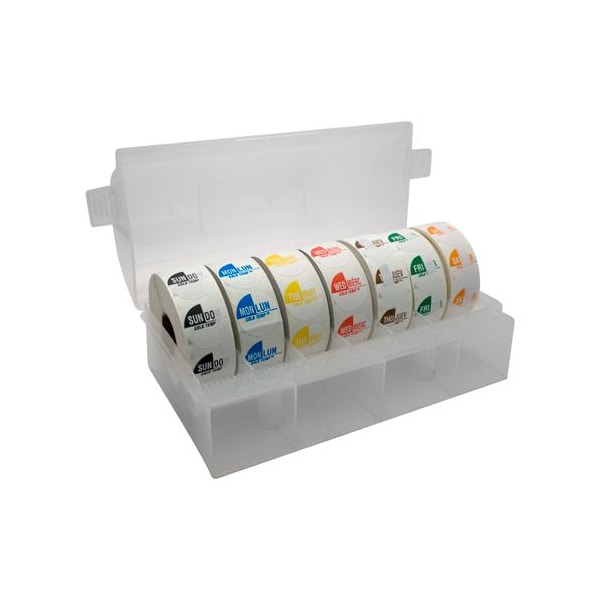 Holds (7) rolls of 1 in wide labels; 9 1/4 in L x 4 3/4 in W x 3 3/4 in H; Replacement label rolls sold separately