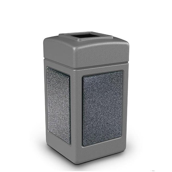 Product Series: 34.5-in. H x 18.5-in. SQ, 59 IbsIdeal indoor or outdoor solution, perfect for any businessDurable and built to last in the harshest weather conditionsEnvironmentally- friendly containers, molded from long-lasting recycled polyethylene that wont rust, dent, chip and is graffiti-resistantDecorative and durable panels made from real stone create an upscale appearance that complements any design style throughout any propertyMaterial is easy to maintain and clean, saving you time and hasslePanels ship inside the waste container minimal assembly requiredGenerous 9-in. Sq. opening allows for convenient disposal to accommodate all types of litterThe innovative snap lid closure and unique patented Grab Bag system secure the trash bag in place for a cleaner appearance with a decreased chance of the lid blowing offOptional 42-gallon liner available to streamline maintenance needs Item #734401100% Recyclable after useStandard 2-day lead time