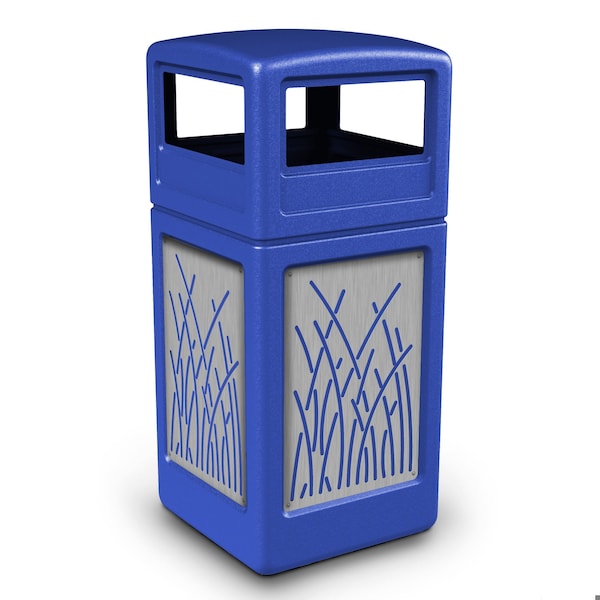 Product Dimensions: 42.25-in. H x 18.5-in. SQ, 35 IbsIdeal indoor or outdoor solution, perfect for any businessDurable and built to last in the harshest weather conditionsEnvironmentally-friendly containers, constructed from long-lasting recycled polyethylene with heavy-gauge stainless steel panels that wont rust, dent, and chipMaterial is easy to maintain and clean, saving you time and hassleCovered Dome-lid keeps weather elements out and provides convenient access to disposal on all four sides four 13-in. x 6-in. openingsThe innovative snap lid closure and unique patented Grab Bag system secure the trash bag in place for a cleaner appearance with a decreased chance of the lid blowing offOptional 42-gallon liner available to streamline maintenance needs Item #734401100% Recyclable after useStandard 2-day lead time