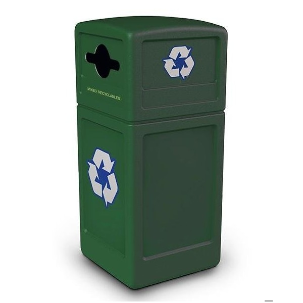 Product Dimensions: 41.75-in. H x 18.5-in. SQ, 24 IbsIdeal indoor or outdoor solution, perfect for any businessDurable and built to last in the harshest weather conditionsEnvironmentally- friendly containers, molded from long-lasting recycled polyethylene that wont rust, dent, chip and is graffiti-resistantMaterial is easy to maintain and clean, saving you time and hassleCovered Dome-lid provides convenient access to disposal on two sidesDecals included: Mixed Recyclables along with recycling logos to clearly promote recyclingThe innovative snap lid closure and unique patented Grab Bag system secure the trash bag in place for a cleaner appearance with a decreased chance of the lid blowing offOptional 42-gallon liner available to streamline maintenance needs Item #734401100% Recyclable after useStandard 2-day lead time