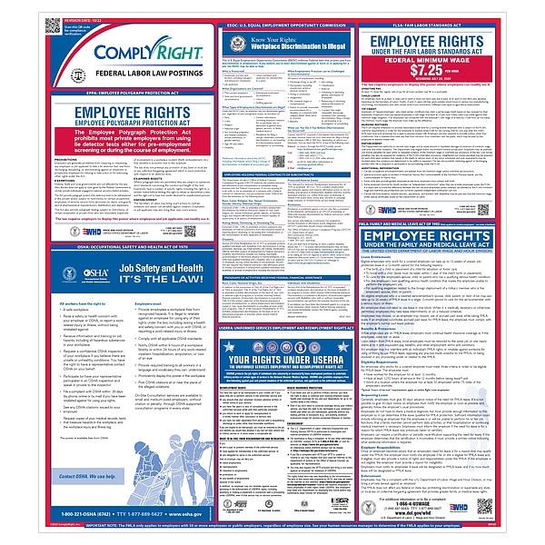 Labor Law Poster, Compliance Type Federal Labor Law, FMLA Notice Included Yes, Height 27 in, Includes (1) Poster: Paid Sick Leave (English/Spanish), (1) State Poster: Fair Employment, Electronic Monitoring, Managed Care, Minimum Wage, No Smoking, OSHA, Language English, Material Plastic, Number of Posters Included 6, Product Type Poster, Subject Matter Federal Labor Law, Subscription Length Not Applicable, Width 24 in, State/Province DC, Workers Compensation Notice Included Not Applicable