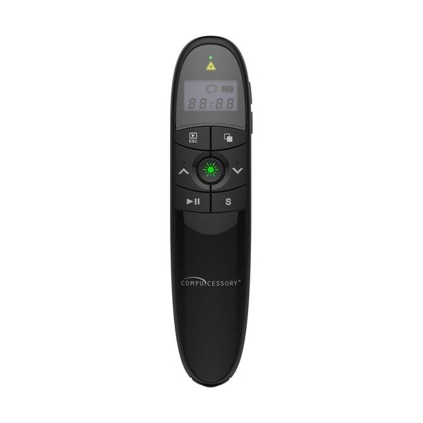 Wireless presenter features a bright, green laser pointer to ensure it's easy to see on any presentation screen, even in a brightly lit room. Easy-to-use operation combines functions of page up, page down, play slides and quick black screen for more control during your presentation. Vibration function provides a convenient reminder to help you keep track of time. LCD timer and battery-power indicator prevent unexpected runout. Volume buttons provide a simple way to adjust your audio as needed. Auto shutoff when the receiver is stored in presenter ensures efficient operation. Presenter requires two AAA batteries sold separately. Wireless range is up to 98.4' 30 meters.