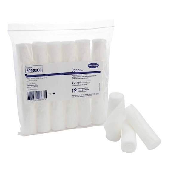 Hartmann's Conco bandages hold primary dressings in place with controlled compression, reducing risk of constriction or slippage The woven gauze material adheres to itself, making application and wrapping easy These bandages are also flexible for conforming around bodily contours The woven bandage has finished edges to help prevent unraveling and lint They're safe for use on burns and other types of injuries 4 inches x 4-1/10 yards