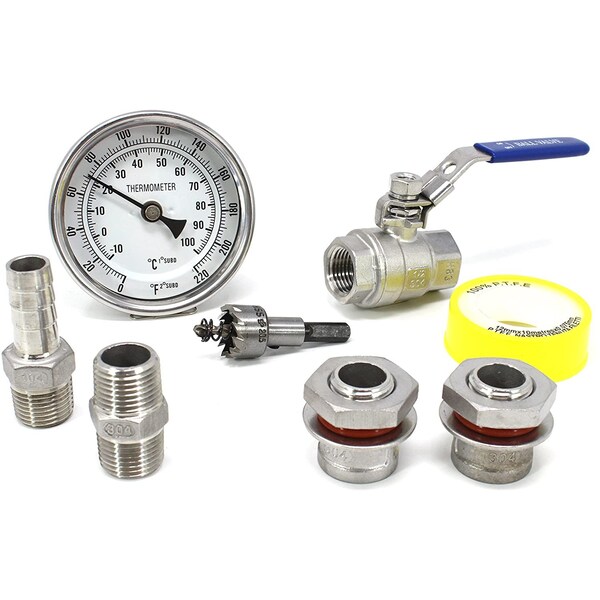 Starter Kit Includes: 3" Thermometer, Weldless Bulkhead Fittings x2, Ball Valve, 1/2" Barbed Hose, Hex Nut, Hole Saw, and Thread Tape