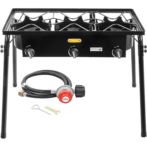 Features: -Set includes: Triple burner outdoor stove with high pressure regulator hose. -Material: Burner is made from heavy duty cast iron with weather proof coating, will last a lifetime. -Three individual burner stoves on stand with separate heat control burning up to 55000 BTU. -High pressure regulator, hose, and connector included. -Stand has detachable legs for easy storage. -Capable of supporting three 60 Quart stockpots. Product Type: -Triple burner. Material: -Cast iron. Finish: -Black. Pieces Included: -Burner. Dimensions: -Each stove has approximately 12" space. Overall Height - Top to Bottom: -29". Overall Width - Side to Side: -35". Overall Depth - Front to Back: -18". Overall Product Weight: -39 lbs.