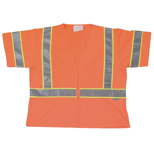 High Visibility Vest, ANSI Class 3, Vest Size 2XL, Traffic Safety Vest Color Orange/Red, Fits Chest Size 54 in, Gender Men's, Stripe Color Silver, Vest Material Polyester, Vest Closure Type Zipper, ATPV Rating Not Rated, Vest Stripe Color Family Silver, Back Stripe Pattern U, Vest Length 26 in, Number of Pockets (Inside) 3, Number of Pockets (Outside) 2, Number of Pockets with Closure 0, Features 360 Degrees Visibility, Standards Meets ANSI-ISEA 107-2004