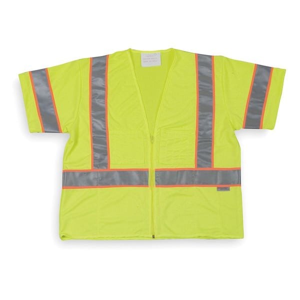 High Visibility Vest, ANSI Class 3, Vest Size 3XL, Traffic Safety Vest Color Yellow/Green, Fits Chest Size 56 in, Gender Men's, Stripe Color Orange/Silver, Vest Material Polyester, Vest Closure Type Zipper, ATPV Rating Not Rated, Vest Stripe Color Family Orange/Red/Silver, Back Stripe Pattern U, Vest Length 23 in, Number of Pockets (Inside) 3, Number of Pockets (Outside) 2, Number of Pockets with Closure 0, Features 360 Degrees Visibility, Standards Meets ANSI-ISEA 107-2004